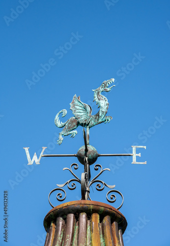 dragon, gazebo, dublin, ireland, weathercock, vane, weather vane, garden, phoenix, park, blue skies, decor, style, west, east, decoration, irish, detail, closeup, close, design, roof, metal, copper, old