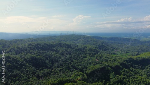 Dramatic Aerial drone view of hills with lush green trees with morning mist above with a background of rows of mountains