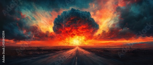 apocalyptic, landscape, sunset, disaster, destruction, end of the world, explosion, nuclear, road, desolate, dramatic, sky, cloud, fire, orange, red, black, dark, horizon, wasteland, aftermath, danger, threat, war, conflict, bomb, atomic, radiation, pollution, environment, climate change, doomsday, armageddon, future, abstract, surreal, fantasy, concept, illustration, painting, digital artwork, ai