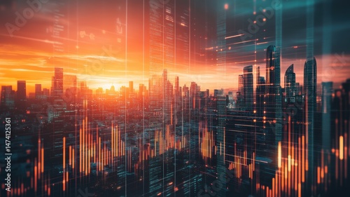 big, datum, dramatic, city landscape, sunset, futuristic, digital, urban, innovation, technically, progression, skyline, city, orange, red, abstract, architecture, building, skyscraper, overlay, matrix, modern, tech, future, glow, reflections, light, dynamic, horizon, evening, dusk, silhouette, vibrant, progress, metropolis, investment, finance, chart, signal, grid, technology, network, transformation, advancement, illumination