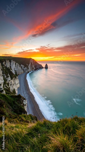 sunset, beach, coast, ocean, sea, sky, cloud, dramatic, nature, landscape, scenic, sunrise, vibrant, colourful, beautiful, travel, vacation, photo, cliff, rock, water, gold, horizon, view, summer