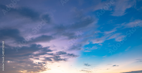 Dramatic Colorful Sunset Sky. Clouds with Sunrays. Cloudscape Sunset Background. Panorama Sky. Dramatic sky with clouds at sunset or sunrise. Sunset Sundown. Sky with colorful clouds.