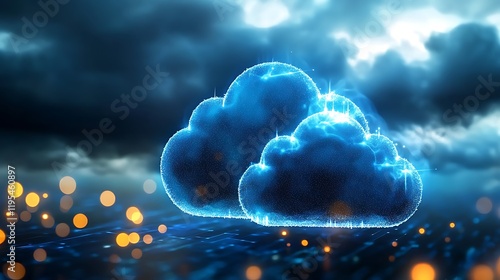 Dramatic digital cloud network displaying glowing energy surges in a moody turbulent atmospheric landscape Conceptual of modern data streaming and cloud based technology