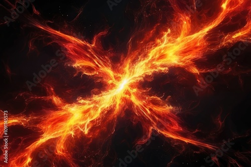 Dramatic fire and smoke effect glowing red and yellow colors exploding outwards with center space. Vivid and hot hell abstract or blazing fire background or wallpaper
