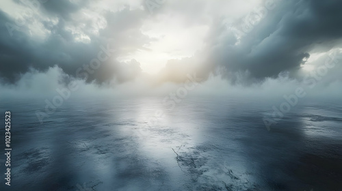 Dramatic Foggy Landscape with a Calm Water Surface 3D Illustration