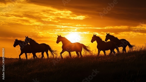Dramatic herd of horses silhouetted against a vibrant sunset horizon
