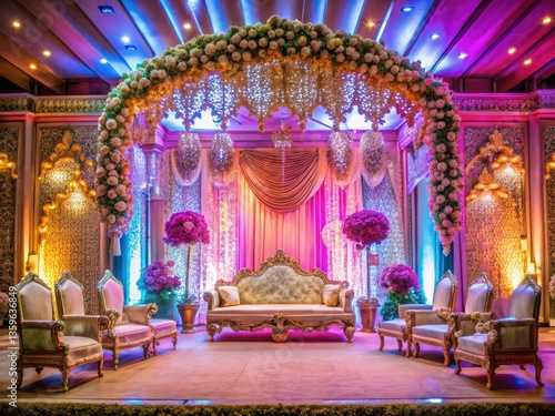 Dramatic lighting illuminates a breathtaking pastel-hued royal Indian wedding stage; bokeh photography at its finest.
