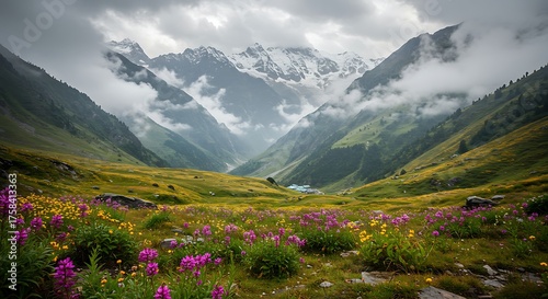 Dramatic mountain landscape with cloudy sky and lush green valley