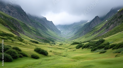 Dramatic Mountain Range with Fog Shrouded Peaks and Lush Green Valley Under Cloudy Sky