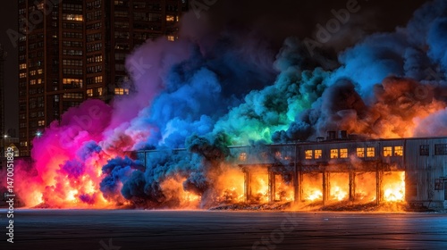 Dramatic Nighttime Fire Building engulfed in vibrant colored smoke and flames