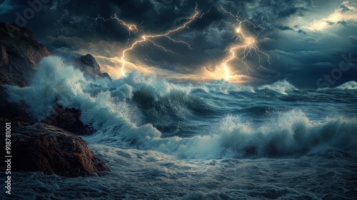 Dramatic Ocean Storm with Lightning Strikes and Waves Crashing on Rocky Coastline.