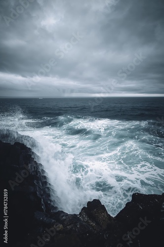 ocean, sea, wave, water, nature, storm, dramatic, powerful, crashing, dark, moody, sky, cloud, rugged, cliff, coastal, seascape, wild, energy, movement, turbulent, spray, foam, deep, blue, grey, atmospheric, motion, natural, beauty, landscape, force, weather, environment, travel, exploration, adventure, solitude, power, fury, raw