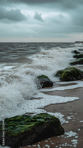 Dramatic seascape with mossy rocks and crashing waves under cloudy sky