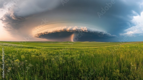 Dramatic Storm Clouds with Rainbow Over Lush Green Fields at Sunset