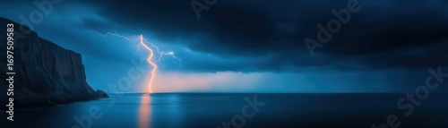 Dramatic stormy ocean scene with dark clouds lightning strike and rugged cliffs du severe weather at sea in moody natural environment
