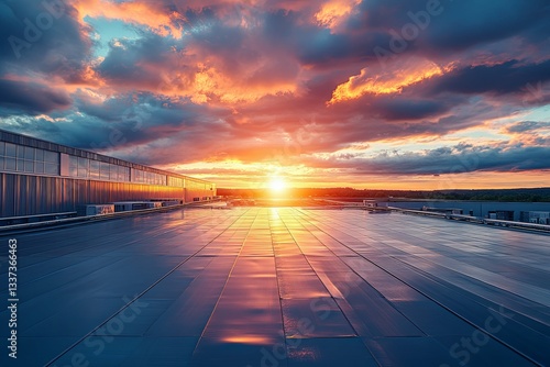 sky, sunset, cloud, building, roof, industrial, architecture, twilight, dawn, evening, dramatic, light, horizon, orange, blue, metal, panel, flat, surface, urban, outdoors, nature, sunlight, glow, bright, scenic, landscape, perspective, texture, pattern, modern, structure, exterior, background, scene, gold, peaceful, abstract, grid, distant, area, open, calm, space