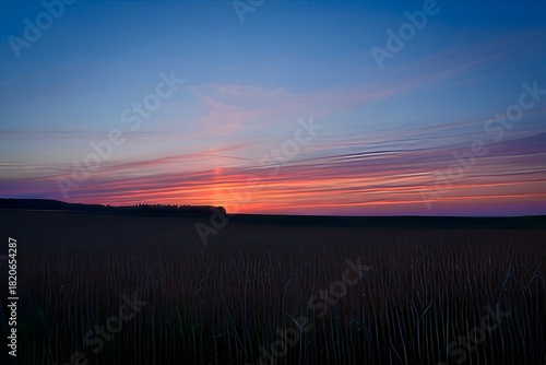 sunset, field, landscape, nature, sky, dusk, twilight, rural, serene, peaceful, horizon, golden hour, vibrant, colourful, cloud, atmospheric, scenic, beauty, calmness, evening, agricultural, farmland, meadow, open space, picturesque, vista, outdoors, environment, rural scene, long exposure, aerial view, calm, stillness, agriculture, vegetation