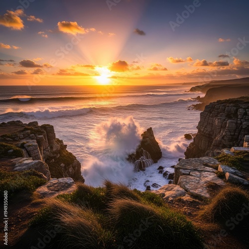 Dramatic sunset over ocean waves crashing against coastal cliffs