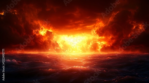 Dramatic Sunset Over Ocean with Fiery Clouds and Gentle Waves