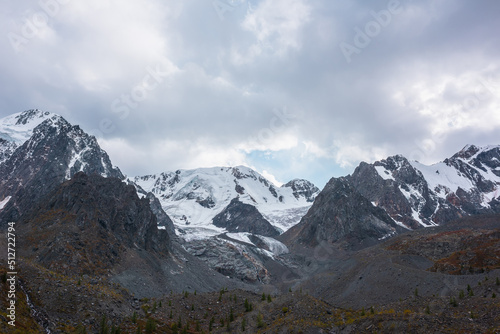 Dramatic view from hills with trees to large snow mountain range with glacier and icefall in cloudy sky. High snowy mountains under rainy clouds. Fading autumn colors in mountains in overcast weather.