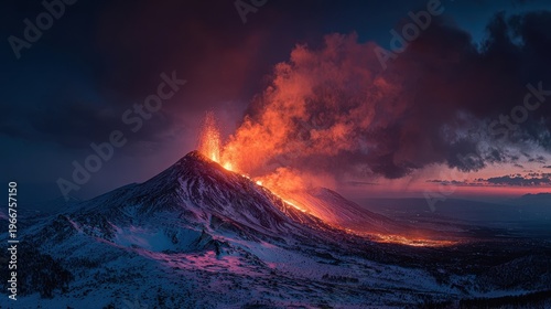 volcano, eruption, lava, fire, mountain, snow, dusk, sunset, night, landscape, nature, geology, disaster, power, force, energy, hot, glowing, orange, red, black, white, blue, sky, cloud, smoke, ash, natural phenomenon, geothermal, earth, planet, destruction, creation, majestic, epic, dramatic, intense, elemental, wilderness, remote, aerial view, fisheye, cinematic, atmospheric, foreboding, awesome, spectacular, photo