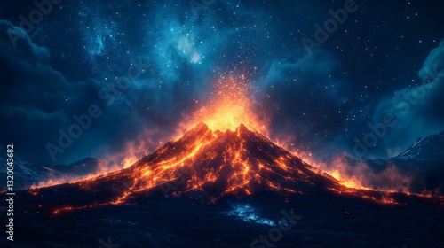volcano, lava, eruption, night, star, glow, fire, landscape, nature, activity, mountain, sky, magma, atmospheric, celestial, beauty, dramatic, illumination, scenery, geologic, spectacle, heat, natural phenomenon, explosive, breathtaking, dark, terrain, glowing, smoke, molten, scenic, wildlife, peaceful, adventure, exploration, wonder, history, ecosystem, phenomena, earth, environment, visual, contrast