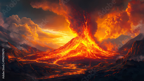 dramatic, volcanic, eruption, flowing, lava, fiery, sky, capturing, nature, raw, power, stunning, beauty, breathtaking, display, illustration