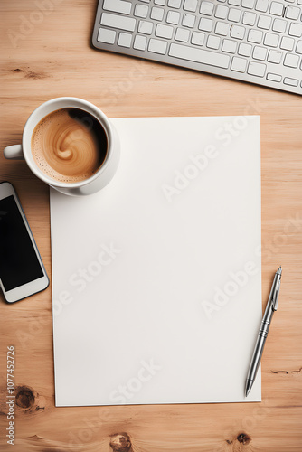 Draufsicht auf einen Holz Schreibtisch mit einer Tasse Kaffee, Handy, Stift und leerem Papier