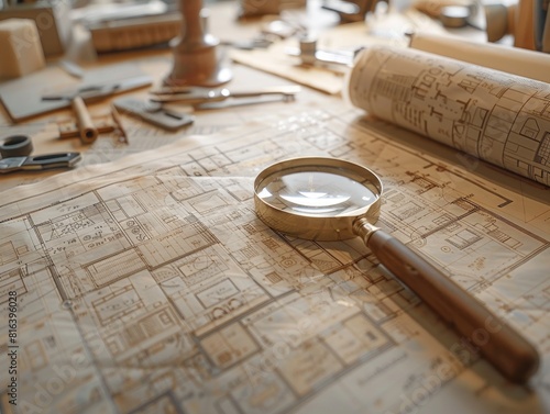 Drawing and magnifying glass on the desktop, glasses