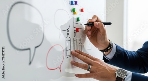 Drawing sketches on whiteboard showing hand sketching process and business strategy. Hand sketching outlines idea generation with creativity and collaborative brainstorming.
