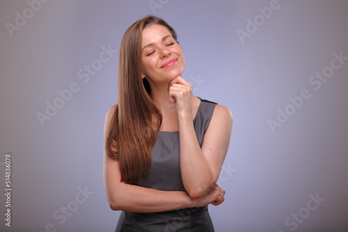 Dreaming Smiling business woman with eyes closed , teacher or adult student isolated female portrait.