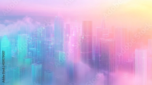 city, skyline, urban, aerial, view, futuristic, technology, abstract, dream, pastel, colours, vibrant, soft, sharpened, cloud, fog, building, architecture, modern, light, glow, digital, design, illustration, background, scene, landscape, fantasy, magical, atmosphere, mood, sunrise, sunset, horizon, perspective, high, rise, tower, metropolis, imaginary, dreamy, elegant, graphic, art, image, picture, photo, visual, concept