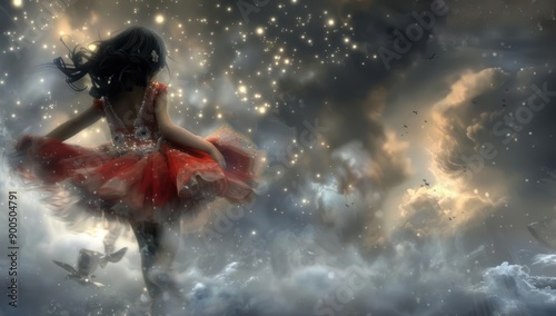 dream, girl, dress, star, fantasy, night, red, cloud, sky, magic, surreal, dance, starry, wonder, imagination, storybook, aethereal, whimsical, twilight, light, innocence, children, mysterious, enchantment, ballet, glow, starlight, floating, captivating, soft, elegance, mystic, delicate, night sky, calmness, celestial, high-coloured, enchanting, shadow