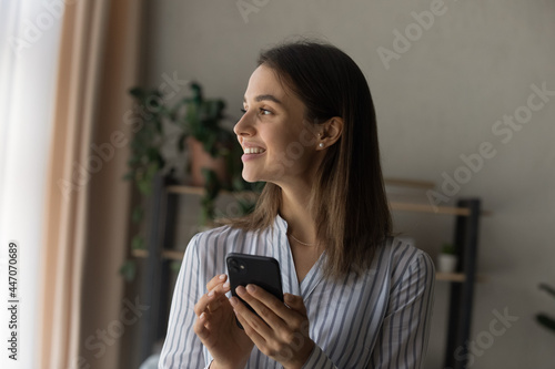 Dreamy beautiful woman holding smartphone standing indoor looks out window having romantic mood while chat sms with boyfriend. Carefree distracted young lady using mobile app, daydreams feels happy