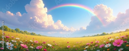 Dreamy landscape, rainbow arc, fluffy cloud formations, pastel wildflowers, sweet, texture