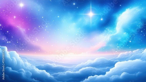 Dreamy night sky, ethereal clouds, vibrant nebula, cosmic swirls, starry expanse, pink and blue gradient, celestial landscape, magical atmosphere, glowing stars, fantasy skyscape, surreal space scene,