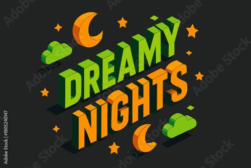 dreamy, night, artistry, isometric, lettering, bold, form, with, angled, perspective, sharp, edge, layered, shadow, floating, geometric, moon, star, cloud, shape, strong, sense