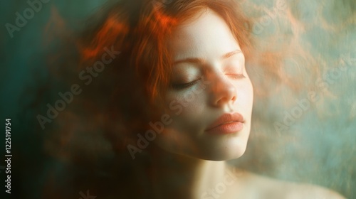 Dreamy portrait of a serene redhead woman in soft focus with ethereal lighting in a studio setting showcasing beauty and tranquility.