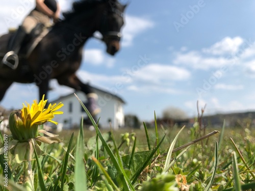 flower, nature, grass, spring, field, yellow, meadow, green, summer, heaven, countryside, plant, taraxacum, bloom, tree, pretty, beauty, dog, daffodil, animal, blue, daisy, country, outdoors, horse