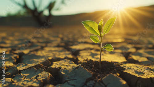 Dried cracked earth under the sun, with green plants sprouting from cracks in the dry soil, symbolizing hope and resilience.