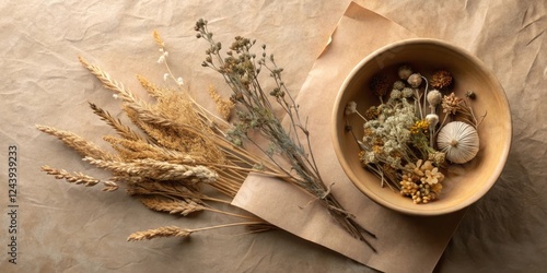 Dried Floral Arrangement with Earthy Tones and Textures on Rustic Paper