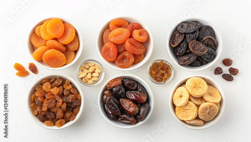 Dried Fruit Collection: Top-Down View of Apricots, Dates, Figs, Raisins, and Berries in Bowls