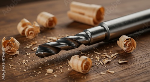 Drill Bit and Wood Shavings on Rustic Wooden Surface Close Up