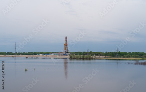 Drilling rig and work trailers on the plain by the lake on a cloudy evening.