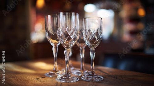 Drinking glasses on wooden surface, warm ambient restaurant lighting and directional window light enhance the mood, creating a sophisticated atmosphere ideal for fine dining or drink concepts