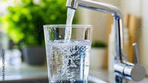 Drinking water flows from the tap into a glass of water in the kitchen, close-up view. Water purifier and tap for drinking clean and fresh water