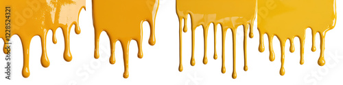 Dripping viscous yellow syrup or honey like liquid flowing and splattering against a bright minimalist yellow and orange abstract background The image has a modern contemporary