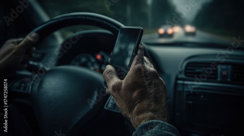 driver, smartphone, steering, wheel, night, road, dim, light, traffic, car, safety, driving, hand, attention, distraction, vehicle, urban, navigation, technology, communication, hazard, multitask, sharpened, interior, shadow, scene, modern, transportation, journey, dark, headlamp, environment, awareness, caution, risky, behaviour, mobile, device, connectivity, night time, concentration, positioning, tension