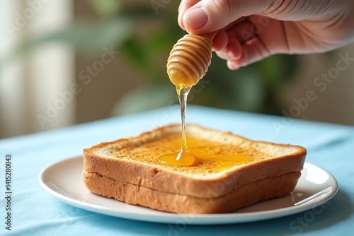 Drizzling Honey Over Toast on Blue Tablecloth for Breakfast Delight