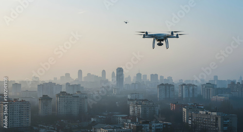 drone, drones, quadcopter, Drone Flying Over Foggy Cityscape at Dawn